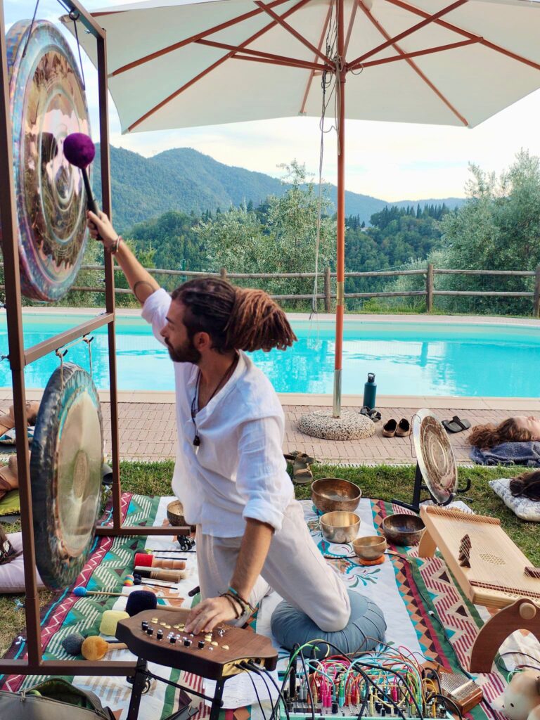 Gli strumenti utilizzati, tra cui Gong, Kotamo, campane e altri strumenti meditativi, si fondono con sofisticati suoni elettronici, creando un paesaggio sonoro che agisce sulle frequenze del corpo e della mente. Questa pratica, frutto di anni di studio, è progettata per indurre uno stato di profonda distensione fisica e leggerezza mentale, favorendo un contatto più intimo con il tuo subconscio, il tutto immerso nella pace e nella bellezza naturale.