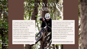 Situato nella pittoresca cittadina costiera di Castagneto Carducci in Toscana, a soli 45 minuti di auto dall’aeroporto internazionale di Pisa, il Tuscany Coast Park è un bike park che offre più di 500 metri di dislivello, affacciato sul Mar Tirreno, e realizzato da professionisti con trail di differente livello adatti a qualunque sia la tua abilità.