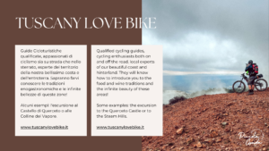 Tuscany Love Bike si dedica con passione alla promozione del cicloturismo e all’uso della bicicletta in Toscana, con un focus speciale sulla Costa degli Etruschi e la Val di Cecina. Il team è composto da guide cicloturistiche altamente qualificate e appassionate, Bike Leader esperte sia di ciclismo che del territorio. Da anni pedalano lungo queste terre e ora offrono servizi organizzativi, consulenze e esperienze uniche in bicicletta adatti a tutti i livelli, sia per gruppi di ciclisti esperti che per chi si avvicina a questa passione per la prima volta.